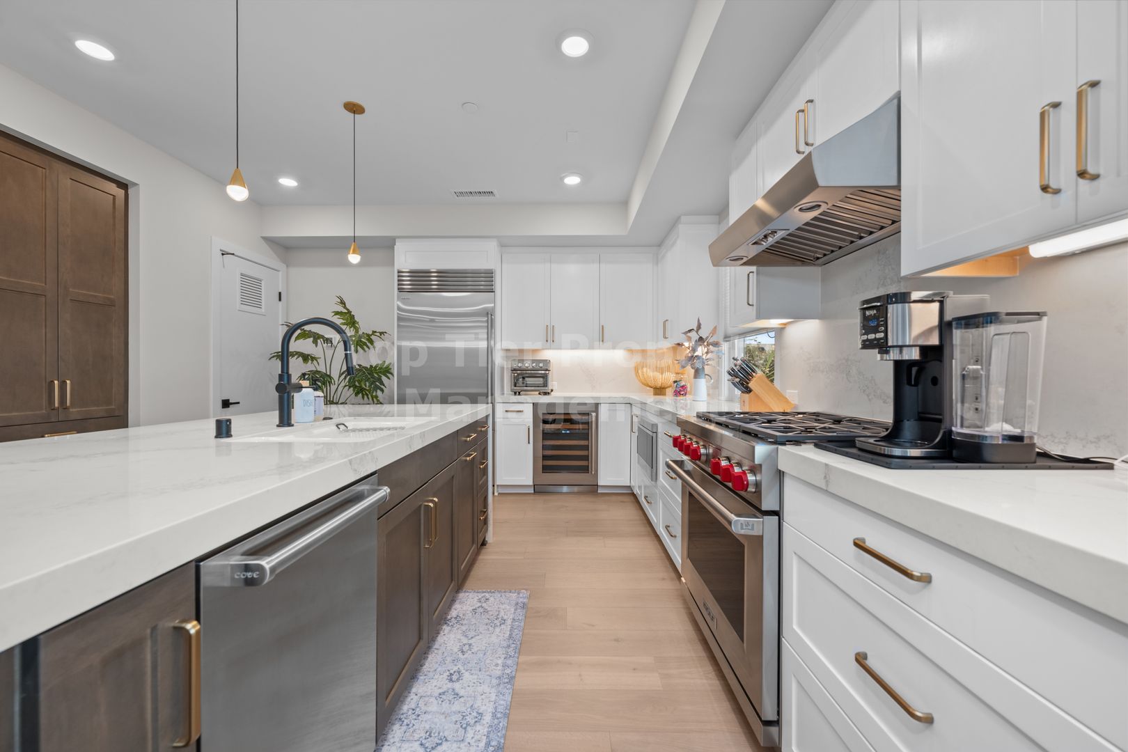 -Chef’s kitchen equipped with premium Wolf and SubZero appliances, including a 36” dual fuel, 6-burner gas range, microwave drawer, built-in SubZero refrigerator, and separate wine fridge