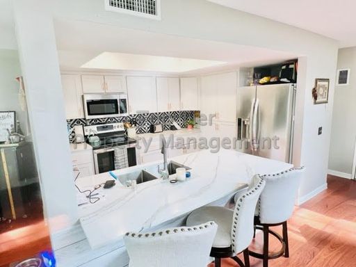 -Remodeled kitchen with all stainless-steel appliances (refrigerator, dishwasher, 4-burner electric stove, and built-in microwave), white shaker cabinets, custom tile backsplash, quartz countertops, and breakfast bar