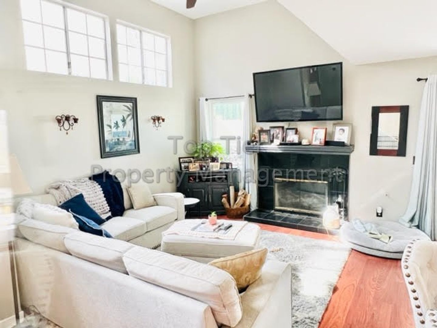 -Spacious living room with vaulted ceilings, lots of natural light, and fireplace (decorative only)