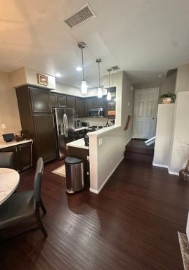-The modern kitchen features Stainless Steel appliances, Quartz Countertops + ample storage with chic cabinetry!