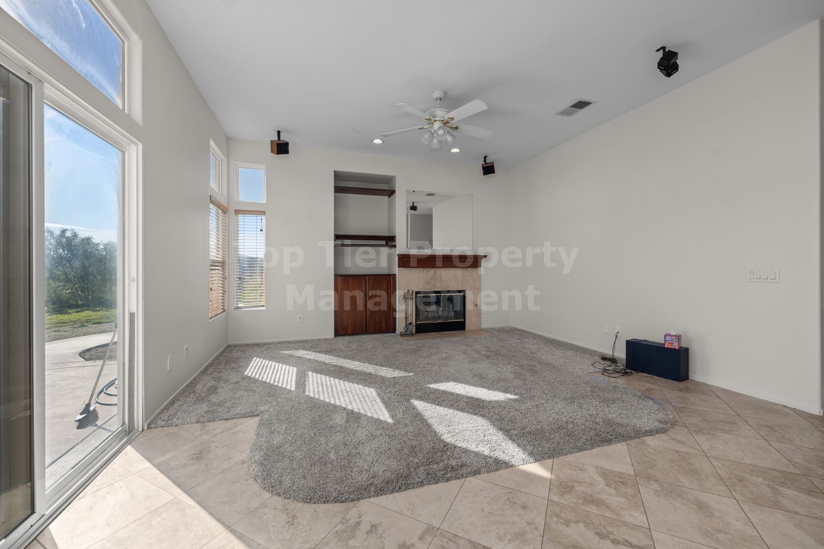 -Family room comes with a fireplace (decorative only) and wall-mounted TV for tenants' use, if desired.