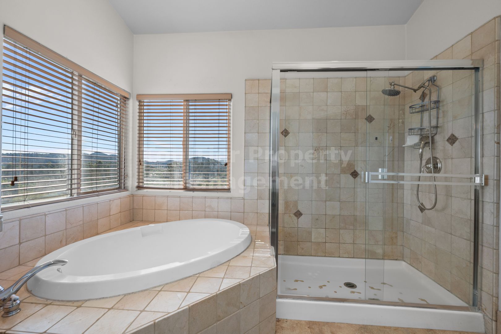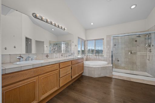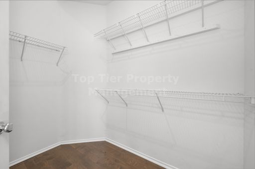 -Primary en-suite has dual-sink vanity, soaking tub, glass enclosed shower, and walk-in closet. Wall-mounted TV for tenants' use, if desired.